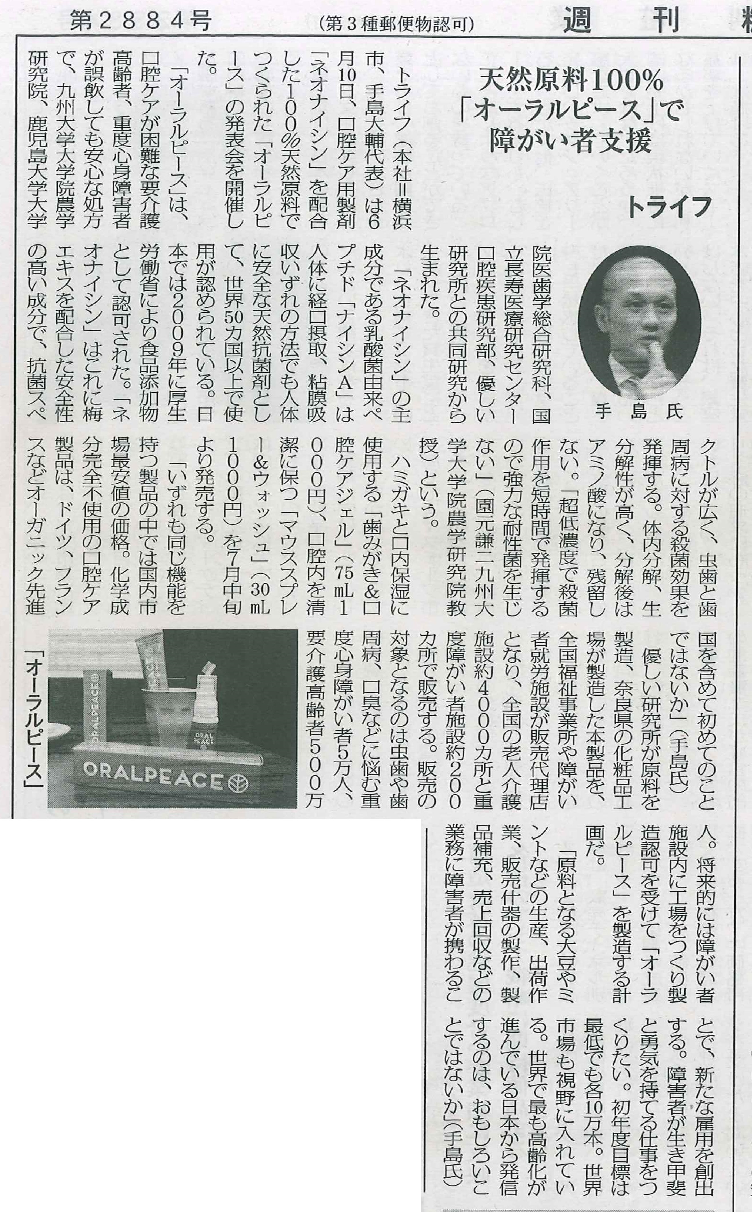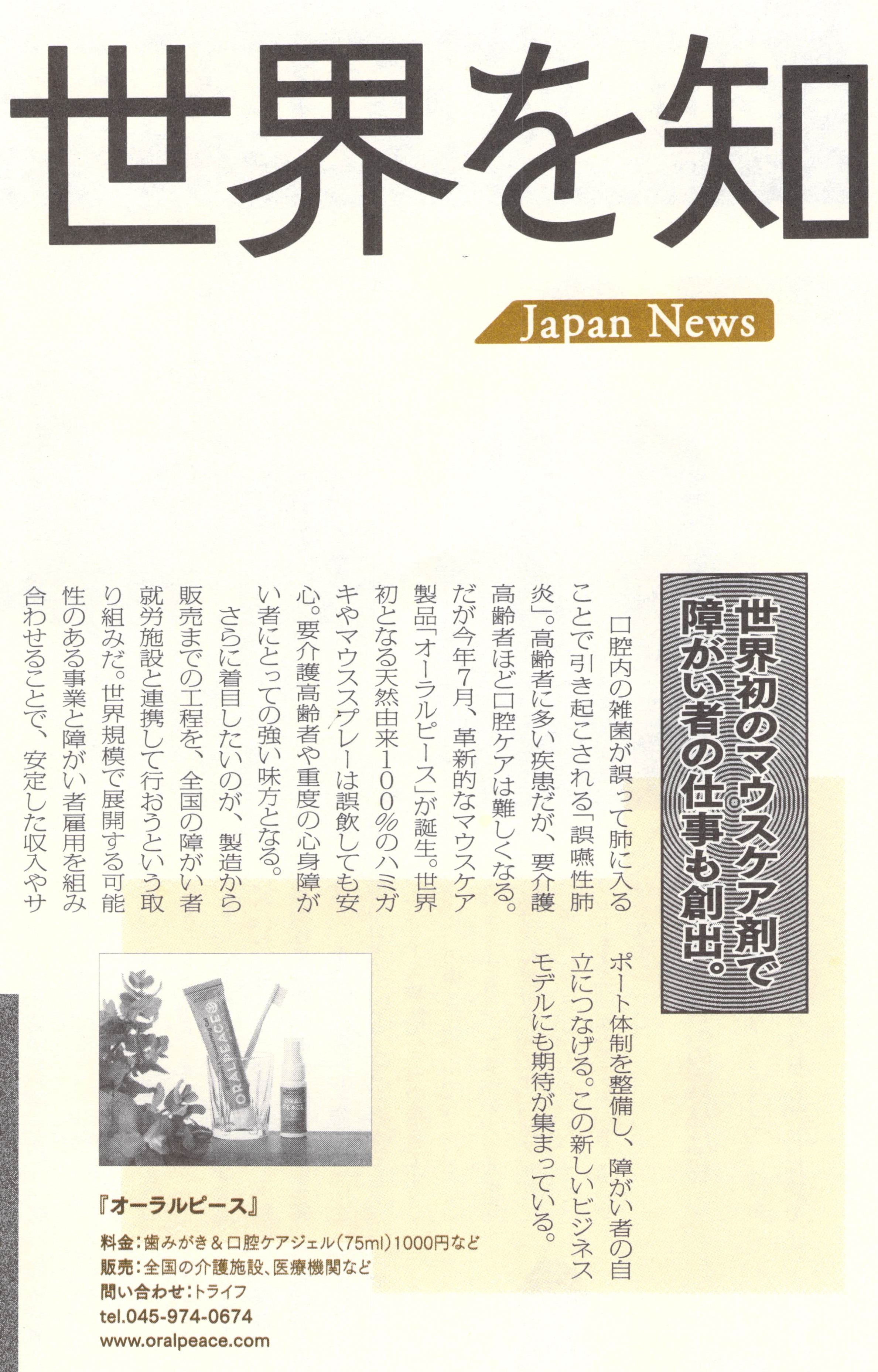 週刊粧業に掲載されました 天然原料100%オーラルピースで障害者支援