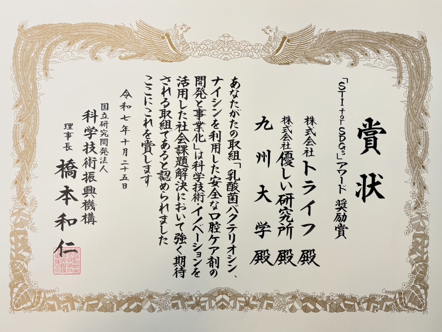 2025 “STI for SDGs” Award Encouragement Prize Organizer: National Research and Development Agency Japan Science and Technology Agency (JST) Organizations: TRIFE Inc., Yasashii Laboratory Inc., Kyushu University (ORALPEACE Project) Initiative Name: Development and commercialization of a safe oral care agent using lactic acid bacteria bacteriocin and nisin (innovative oral care products adopted in space to reduce global caregiving burdens and create jobs for people with disabilities)
